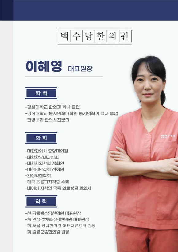 안녕하세요. 19년차 백수당한의원 전문의 이혜영원장입니다.